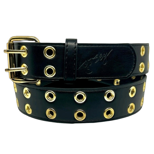 • Faux black color leather with gold grommets, debossed logo• Gold Buckle• Fits 32-40” waist (with room for extra holes)