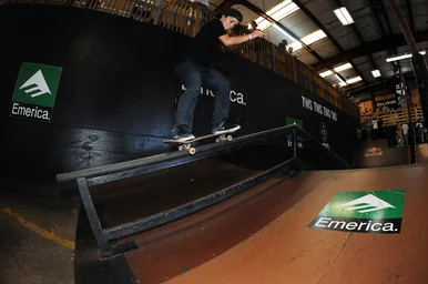 After he destroyed the vert ramp, Jake won the 16 and Up Division with tricks like this kickflip frontboard on the rail.