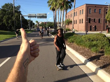 The push began with a short skate to the Bro Bowl. Thumbs up.