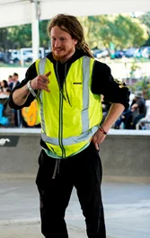 John Bejarano speaks words with his skateboard, this one says: take that you f*&king judges!