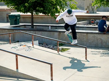 Joe Milazzo comes rip-roaring thru with a Frontside Nosegrind.