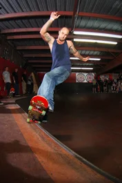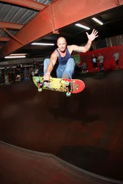 Spike can cruise the Bowl equally well Regular or Goofy; it's amazing to watch. Switch Frontside Grind