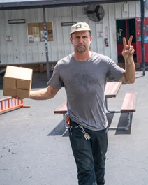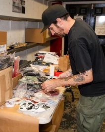 Alec putting together prize packages in the warehouse in preparation for the contest