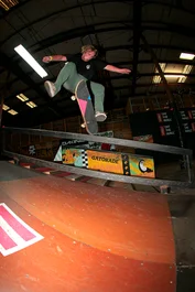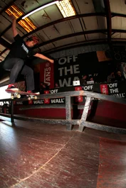 Dakota Hunt here to help his Graffiti Skate Zone crew, who won the last two years. No Comply Tailslide the corner.