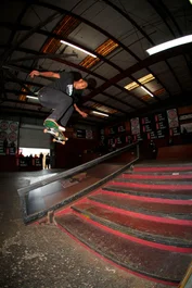 Bud Howard from Clockwork Skate Shop - Tre Flip over the handrail.