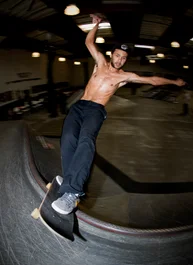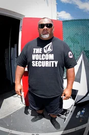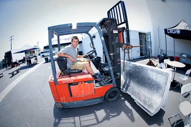 Frankie Villani tests the sturdiness of the walls, and they don’t budge.. Volcom HQ strong like bull.