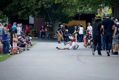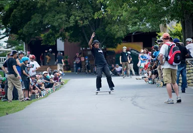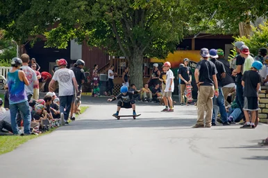 Moving the day along just up the hill, street Qualifiers begin... Rory Doran gets the first heat started with a Front Feeble down the rail.
