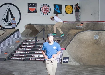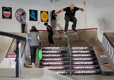 Blake Johnson shows off his stripes with a Front Blunt Slide, while Solomon thinks to himself why waste a frame and throws a Backside Flip in the foreground.