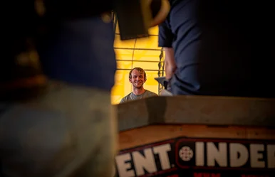 Stiener gets jammed up in the bathroom line eagerly waiting for the carefully configured final results.