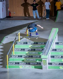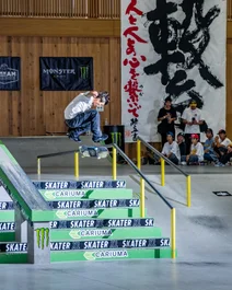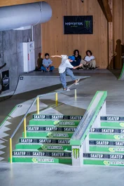 Hozumi heads down the set with a frontside flip