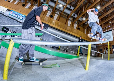 Raimu Abe taking this kickflip high enough to hit another rail before landing in a front lipslide.