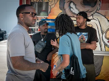 Basically a Cariuma ad in front of a Cariuma ad! Cass Hecht works the crowd.