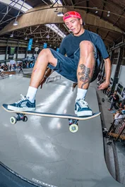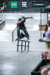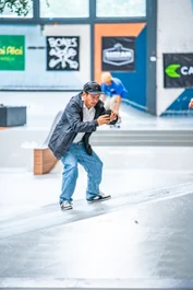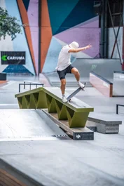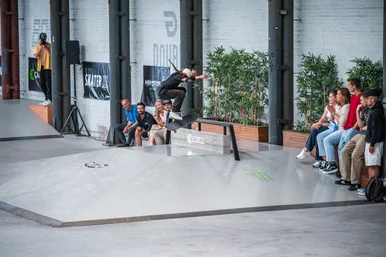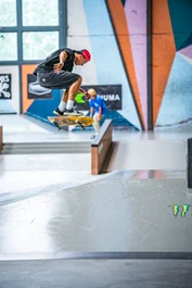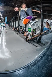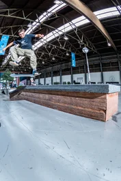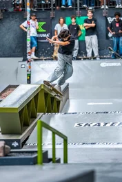 Yesterday's Skater XL Best Trick 3rd place finisher, Reemy Aniceta, takes his Tre flip lip down the round rail