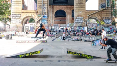 Kayne Jerome hitting the obstacle of the weekend, the bump to rai, with a back smith.