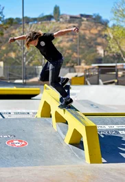 Waldo Diaz takes a page out of Burnquist’s book and gets the Best Trick contest started with a one-footed backside smith grind.