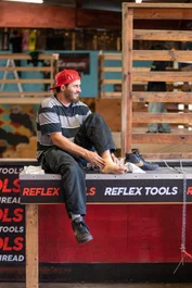 Brandon getting the pads on in the courtyard before heading into the warehouse for practice.