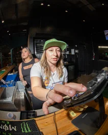 Had to go grab a drink from the venue, but this dude was back behind the bar playin games.
