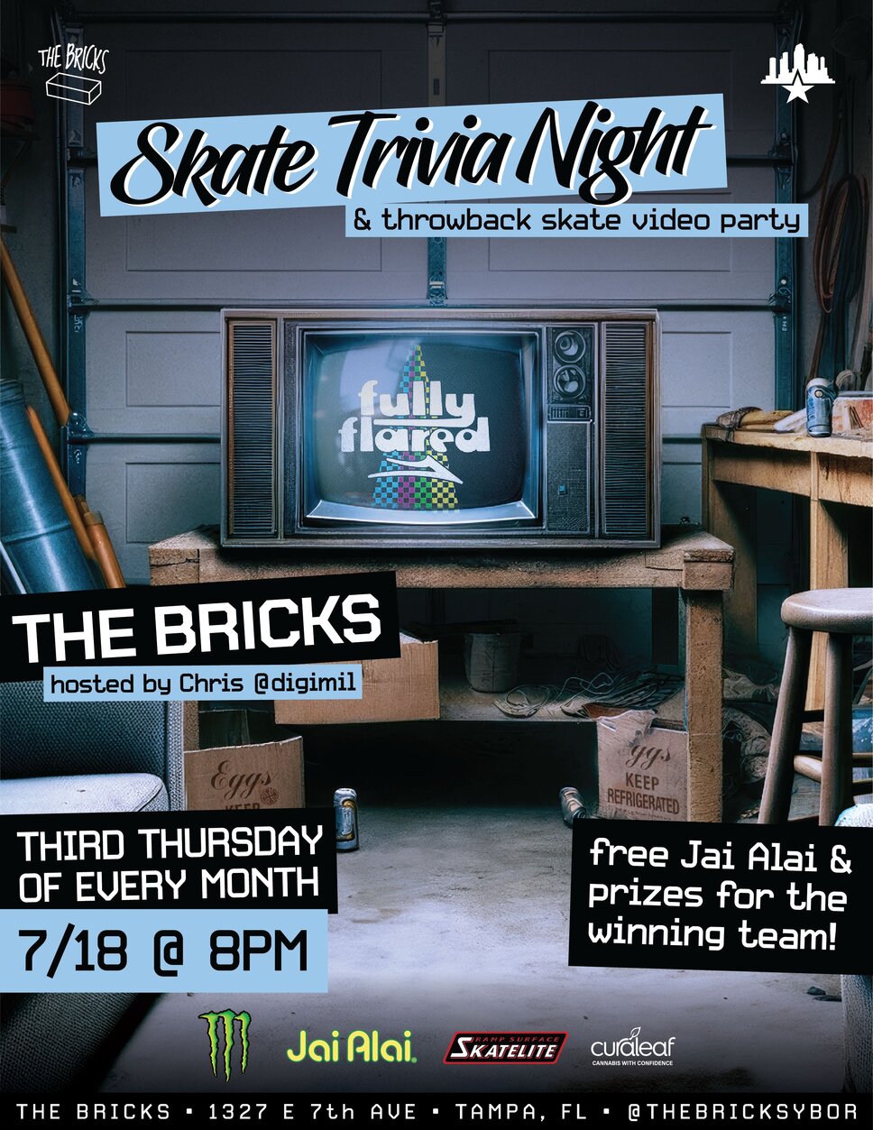 The Skatepark of Tampa crew heads over to The Bricks for Skate Trivia and Throwback Video Night! Local skate nerd Chris Miller is the MC of the evening and is bringing his tough skate history related questions along with. This time around we are watching Lakai's 'Fully Flared' [2007] to start off the night and then diving head first into Lakai infused trivia.