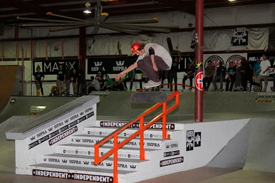 A lot of kids were hard flipping the stair set but Nathan Oxenrider pops one over the handrail.