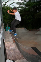 Eli Williams 50-50 pull in to the smaller quarter pipe.