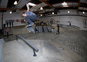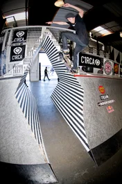 Micky Papa runs things in the Rail and Hubba section, this time with a Nollie Flip Back Grind.