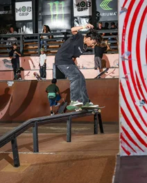 8 and Under Winner Matthew Barrios kicking things off with a flat bar board slide