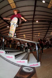 The final event was happening inside: best trick down the stair set and handrail. Another Texas local, Cody McEntire - switch flip back lip.