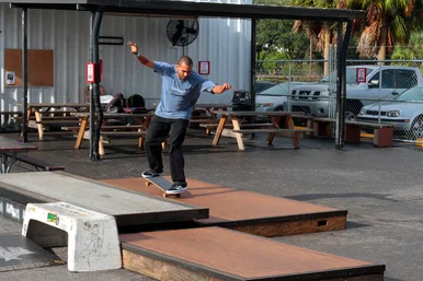 Jacob Copher was messing around on this manual/box contraption, and it took him no time to land this BS 5-0 over the manual pad.
