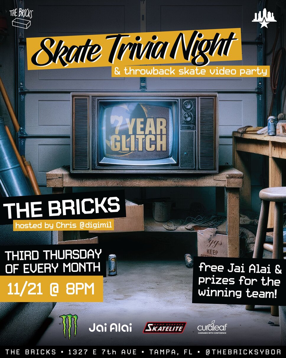 The Skatepark of Tampa crew heads over to The Bricks for Skate Trivia and Throwback Video Night! Local skate nerd Chris Miller is the MC of the evening and is bringing his tough skate history related questions along with. This time around we are watching New Deal's '7 Year Glitch' [2002] to start off the night and then diving head first into New Deal infused trivia.