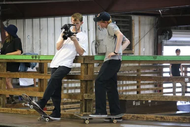 Maintenance alumni Aaron Burkett and a Tampa Pro temp staff member hanging out with some drinks. Look at that mullet-tail!