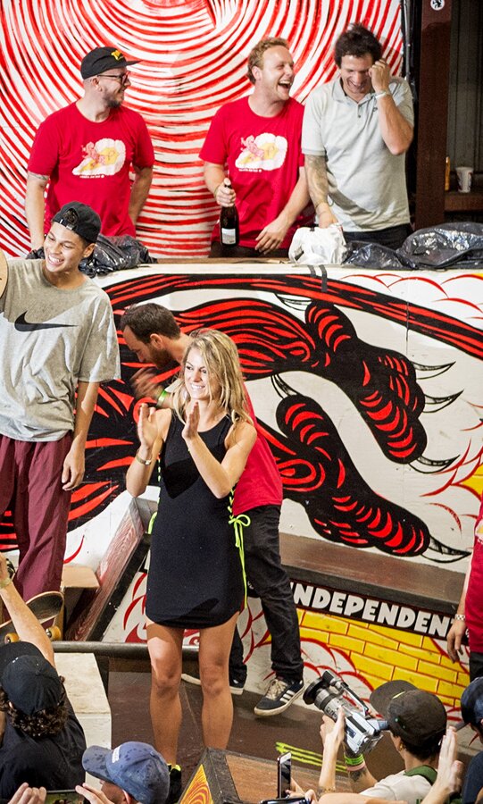 They end the Champagne popping ceremony with a good laugh about the now drenched Monster Energy girl.