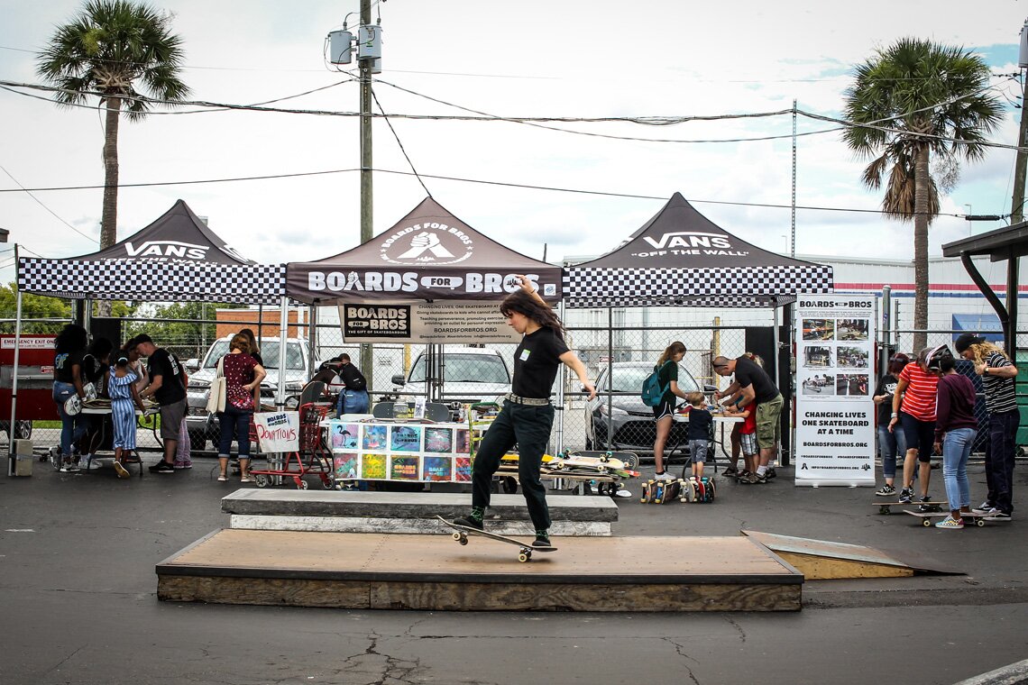Breana Geering manuals across the Manny Pad while the Boards for Bros volunteers are hard at work.