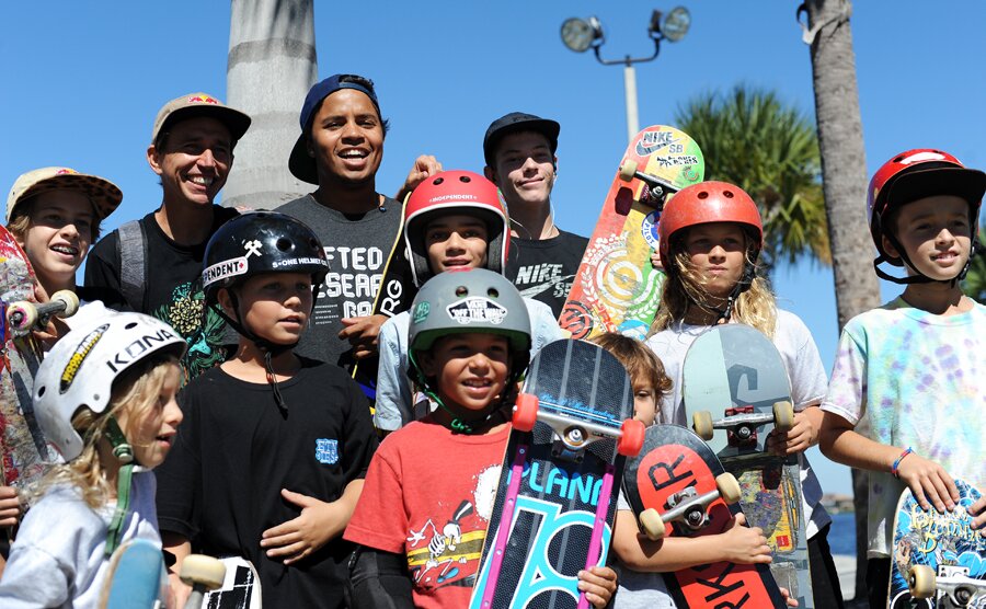 About into the session at Brandenton park the Red Bull team showed up. Jagger Eaton, Joey Brezinski and Felipe Gustavo posed with some of the local kids. Red Bull team riders Alex Midler and Alex Sorgente were already skating and missed out on this photo op.