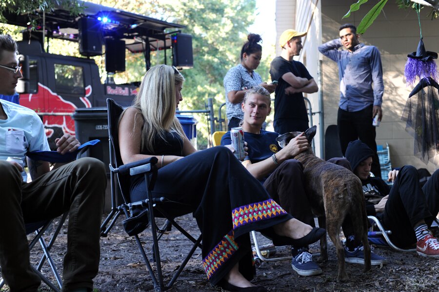 Sunday was a real dog party. I think I counted five or six dogs running around together. Eric McKenney gave some love to Allen Russell's dog Sarge while he carried on a conversation with Jeni. Oh, and that's the Red Bull truck in the background. Cullen Traverso brought it over to blast some tunes for us.
