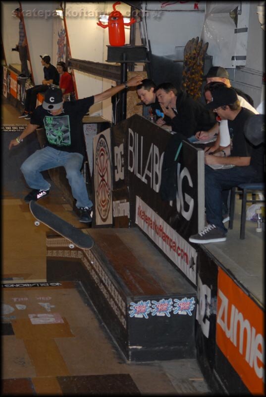 John Muldoon, Brian Perry, Mike Sinclair, Bob Reynolds, and Jason Rothmeyer write down every single trick you do when they're judging, including this 360 flip noseslide from Chris Mendes