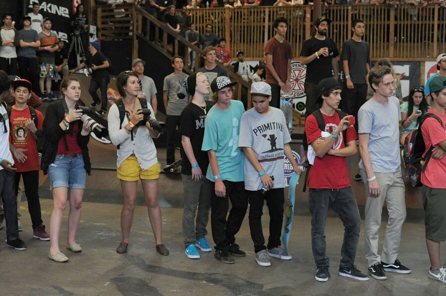 A quote from Tim O'Connor on the mic: "These two girls at the end of the Best Trick lineup got lost at a birdwatching tour and ended up on the street course."