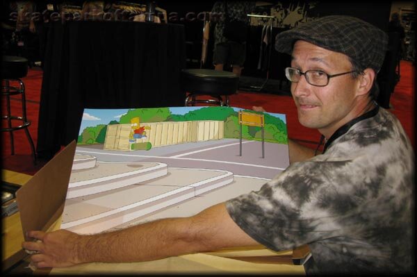 That's Adam from Transworld Skate Business. There's a Skatebook shindig tonight with a bunch of Bart Simpson prints of him killing it at famous skate spots. Looks like he's kickflippping Wallenberg there. ABD by Gerwer, dude. Adam did a video interview with me just now at the show. I can't get it to play from where I'm at. I'm sure I look like a tool ending it shirtless