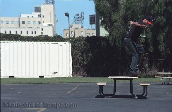 Andrew Reynolds: Andrew did a regular backside flip over a picnic table and then this switch bs nosegrind on the next. That sign on the top of the building in the background is the one from the finale of the worst movie, Charlie's Angel's.
