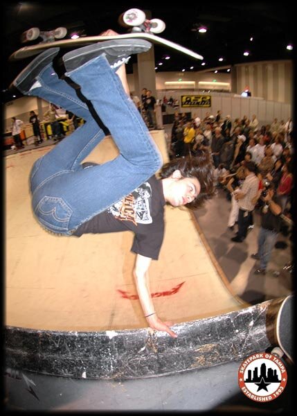 Adrian Mallory and Chaz Pineda got into a frontside invert contest when Schaefer announced on the mic that $100 would go to the first one. I think they ended up splitting it