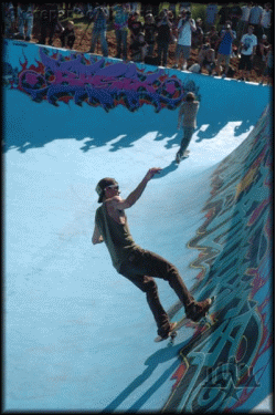Mark Appleyard broke his board doing this nollie big spin tail grab back disaster so he borrowed Steve Stratton's board. He broke that one, too