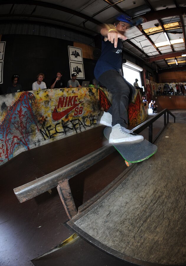 This frontside feeble grind that Julian Lewis did across the bank-to-bank rail was really tweaked out. Julian landed some super hard tricks during practice, but couldn't put it together during his jam. Next time, Julian.