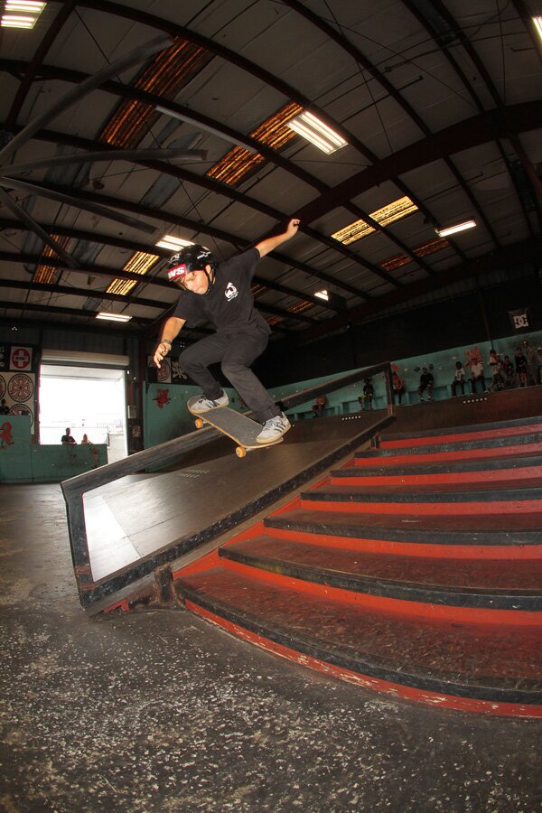 Noah Nagaro was in the 9-12 Age group and still did a BS Boardslide down the handrail!