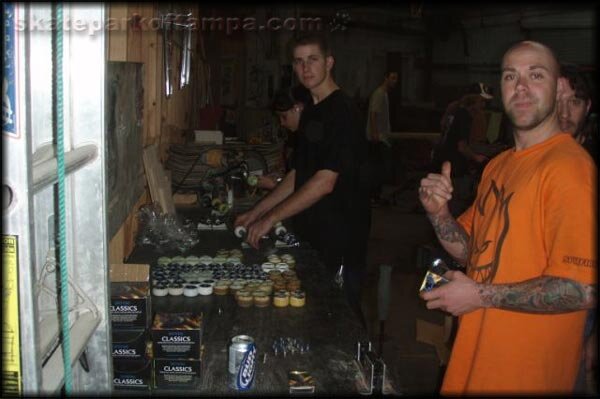 Thanks for the brews, Frosty. This is the beginning of the assembly line. Frosty is putting bearings in the wheels while Boston and Christa are putting the wheels on the trucks