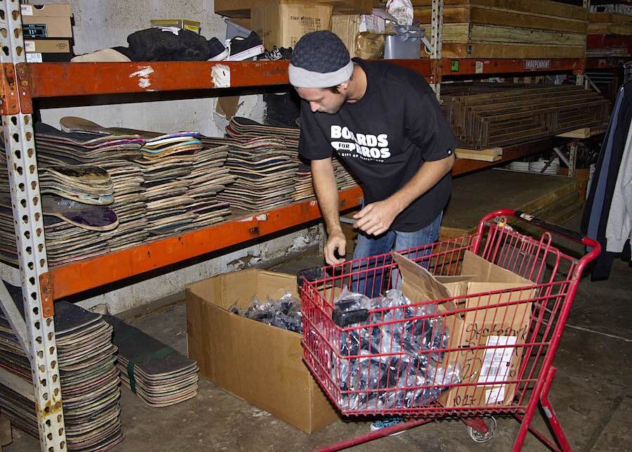 SPoT employee Josh Knight starts organizing all the decks so we can start building the boards for the 1st annual Boards For Bros Build Day in honor of Matt Woods.