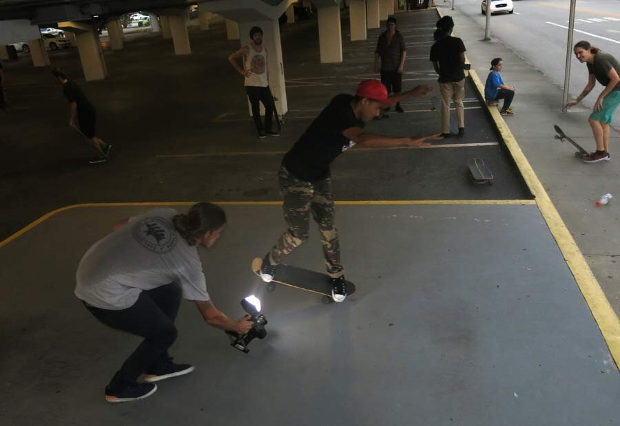 Pit stop at the bottom of the garage for a skate session. Josh Wilson's got drunken nose mannys on lock.