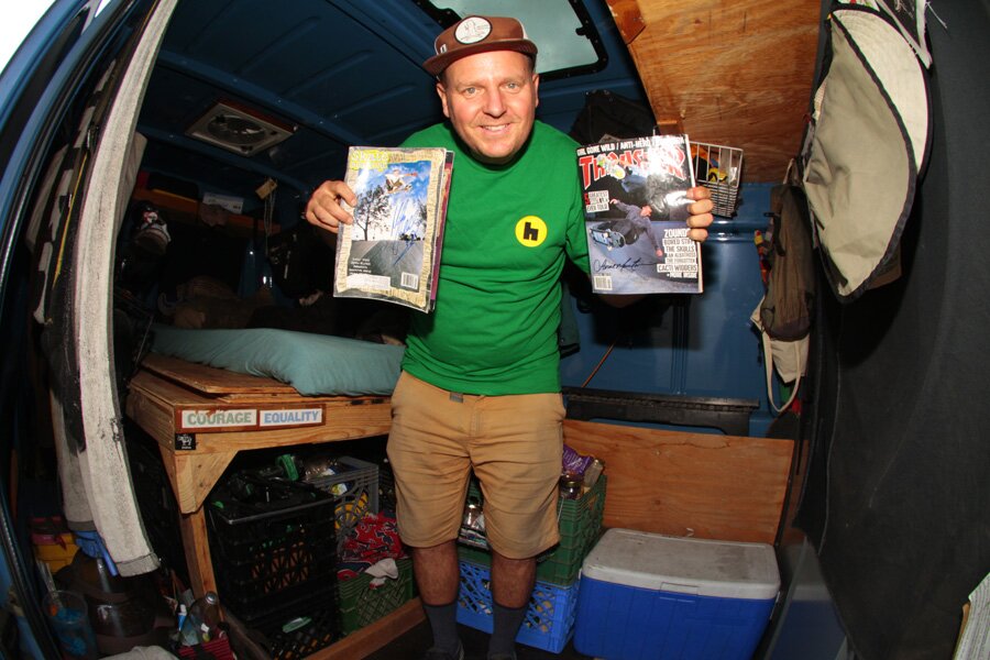 Here’s an inside look of the van and sleeping arrangements. He’s got in his hands a signed Mike V and a Lance Mountain + Rick Mc Crank magazine. Its not fun being broke or else I would buy every one he owns.