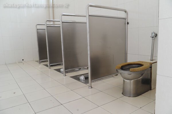 This is a women's public bathroom. Squat with your girlfriends and hope your gear doesn't touch the ground.