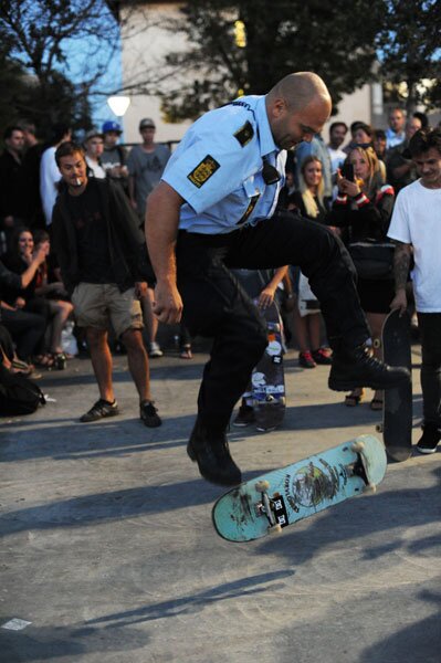A huge circle formed around this cop like a dance party. Skateboarding cops gets everyone hyped.