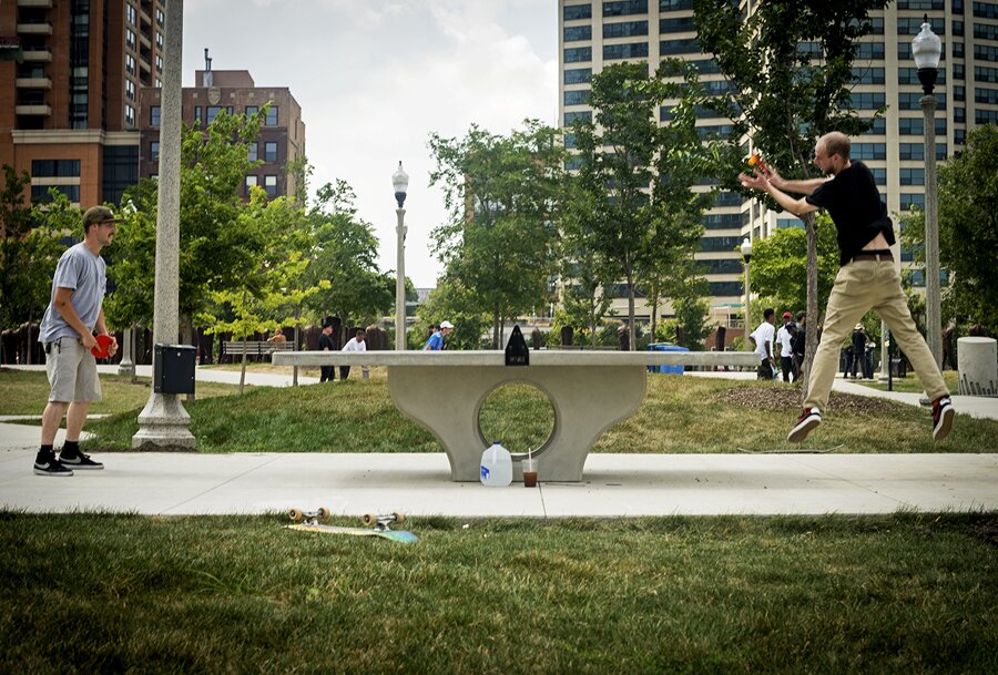 Before we hit it, Chi-town locals Spaz and G take advantage of the new ping-pong table at Grant Skatepark.
