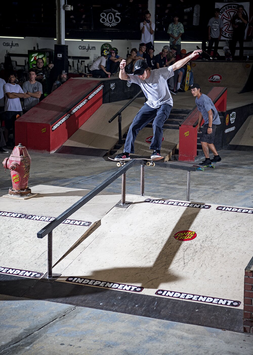 Jonathon Reese’s “warm-up” Boardslide up in over bigspin out before taking the win with a Front Blunt Bigspin the awkward way.